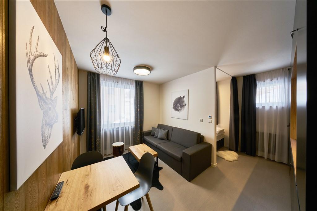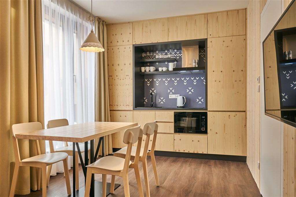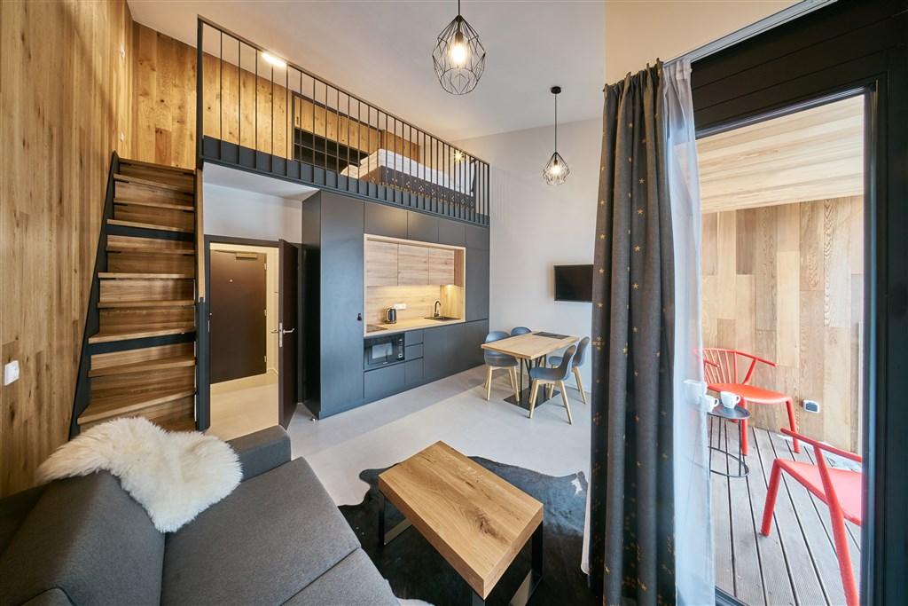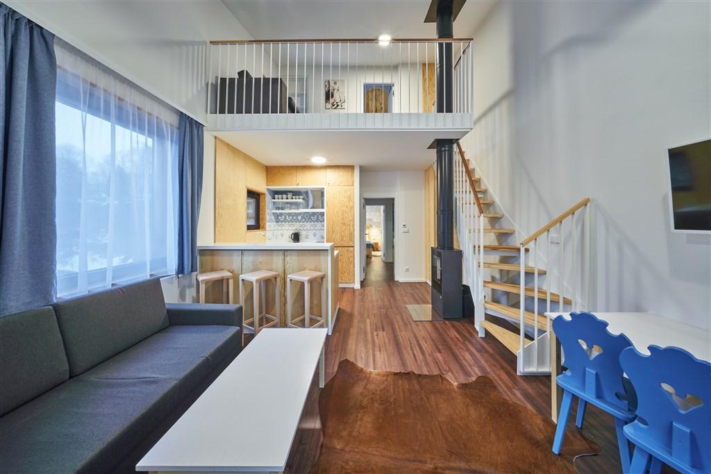 jeden apartmán je mezonetový. Apartmán s dvěma ložnicemi a