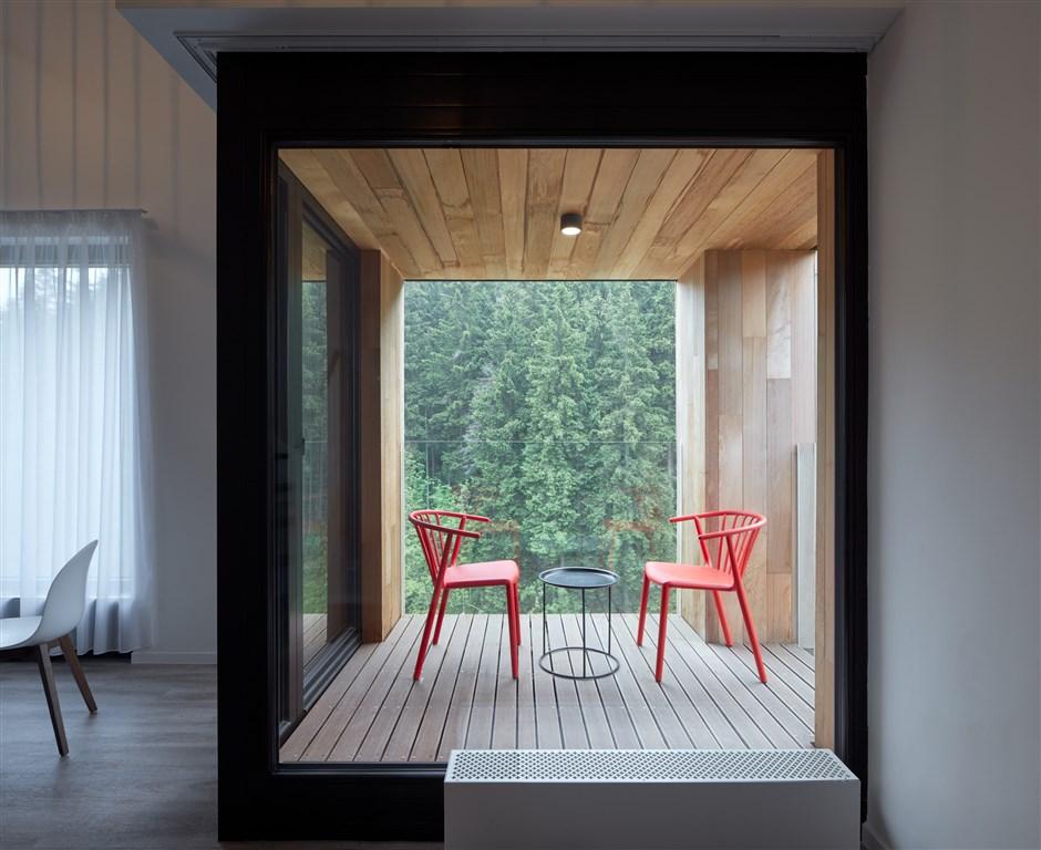 lodžie s výhledem na les, koupelna (finská sauna, sprchový kout,