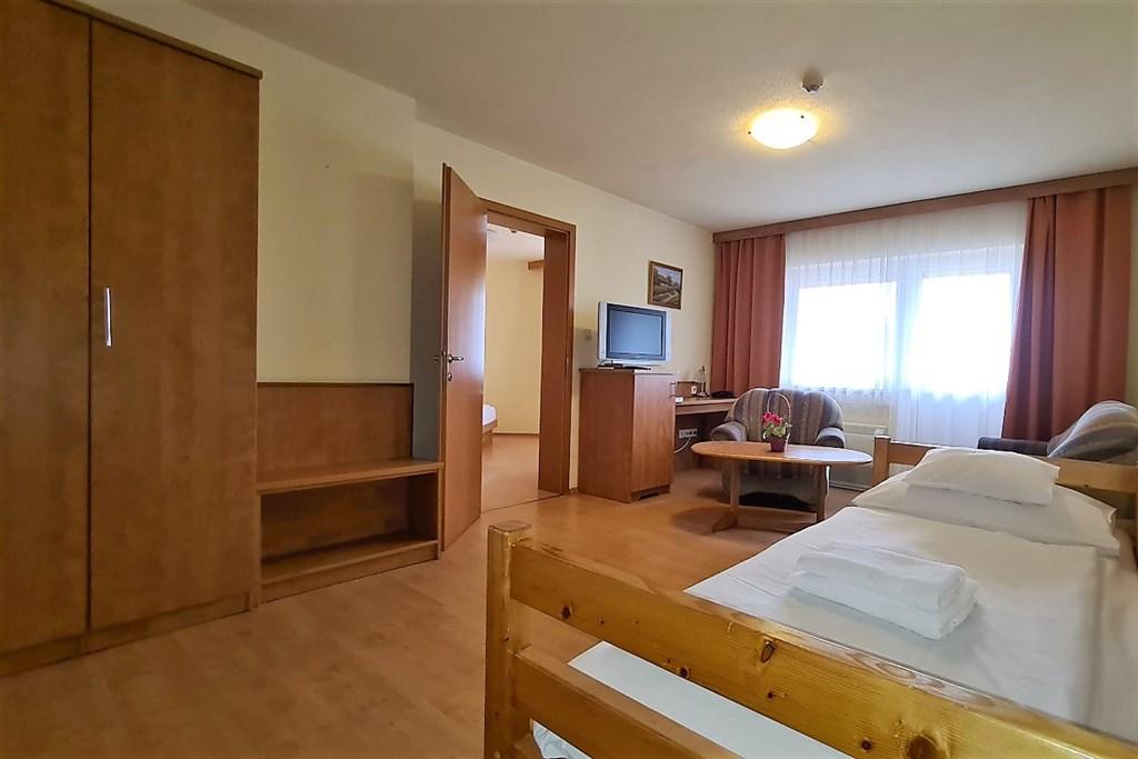 2 - lůžkový rodinný pokoj (40 m²), ložnice a obývací část z rozkládací pohovkou, Spr.+WC, SAT/TV, telefon, balkon. Možnost klimatizace za příplatek. (max. obsazenost 2 dospělí + 3 děti do 13,99 let nebo 3 dospělí + 2 děti do 13,99 let) - pokoje vč. ceny na dotaz.