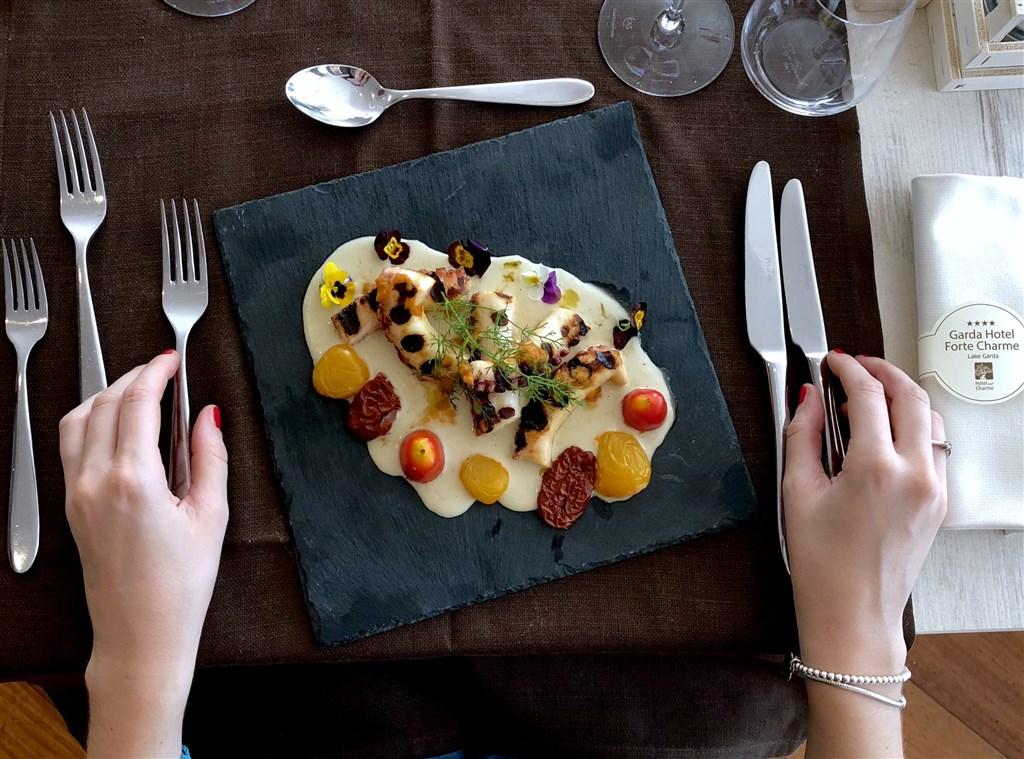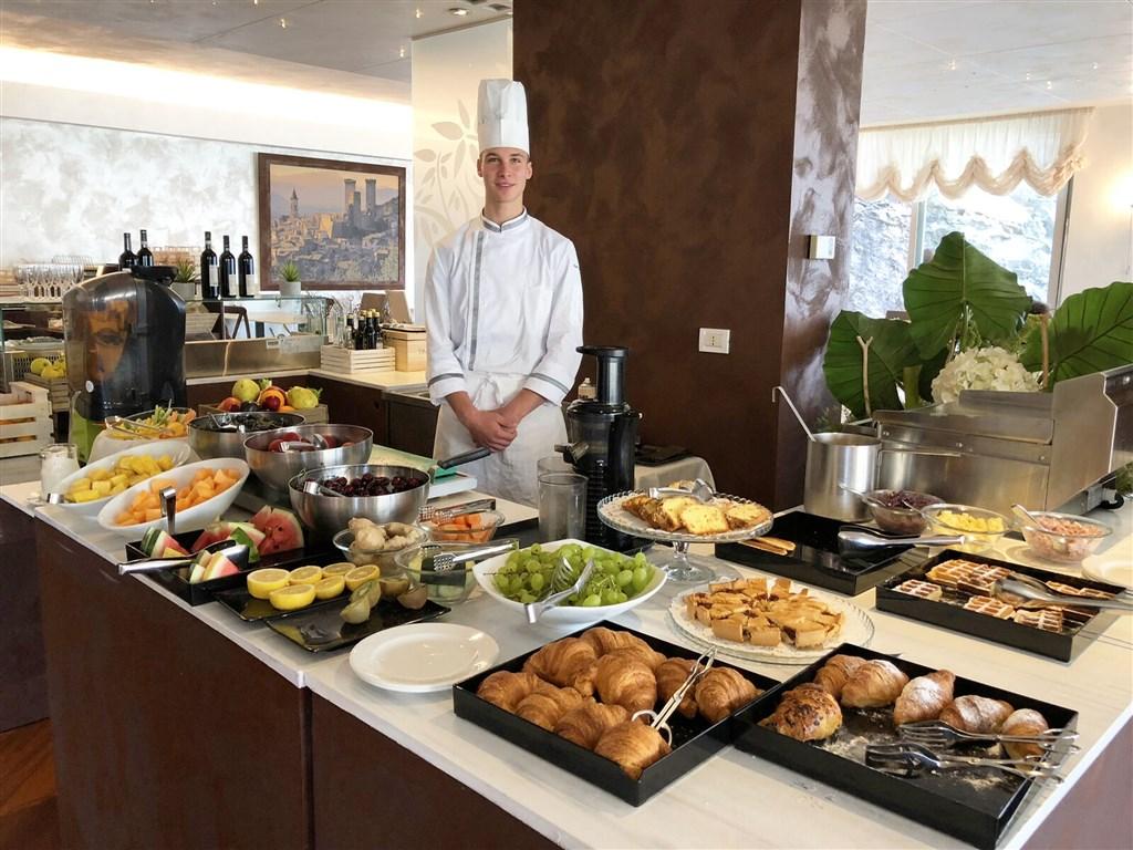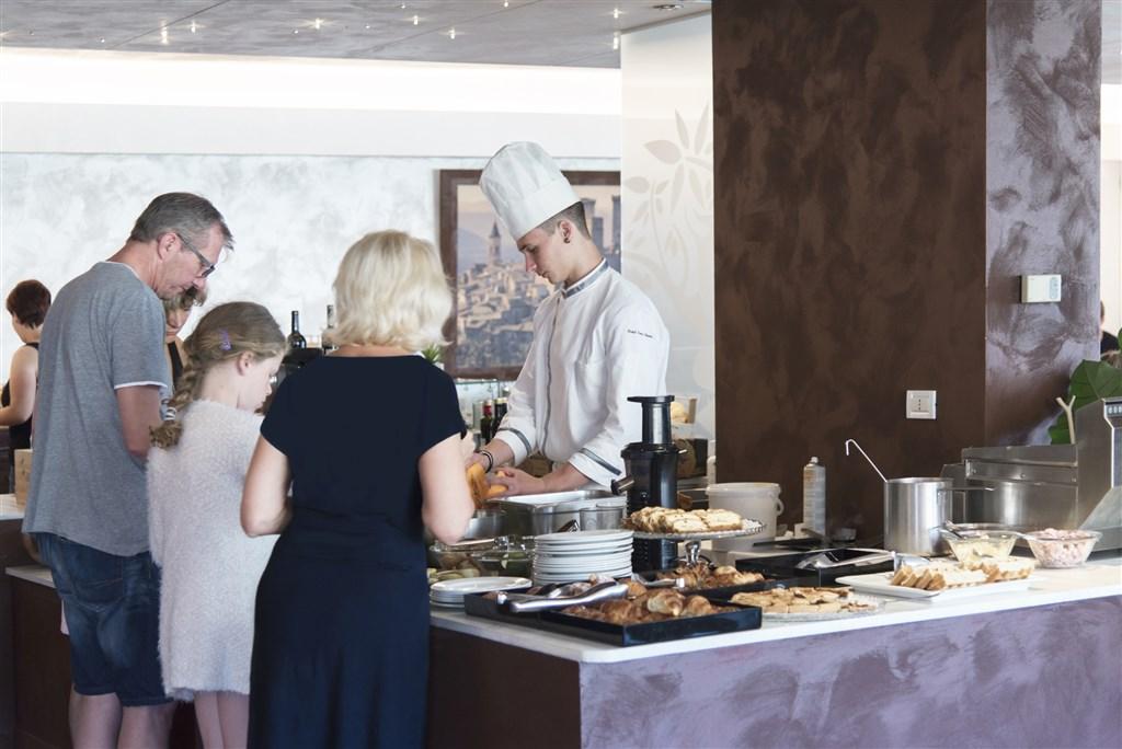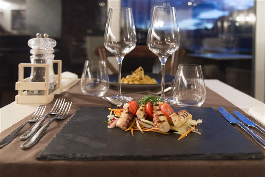 bohatá snídaně formou bufetu (7:00-11:00) s bio, bezlaktózovým a bezlepkovým koutkem. Čtyřchodová večeře s regionálními a mezinárodními pokrmy formou bufetu nebo servírovaná (bezlepková, bezlaktózová, vegetariánská a veganská jídla na vyžádání) od 19:00 do 21:00.