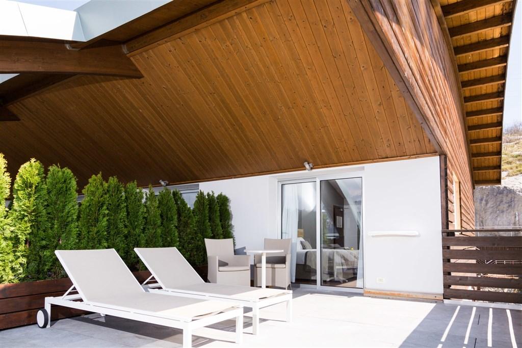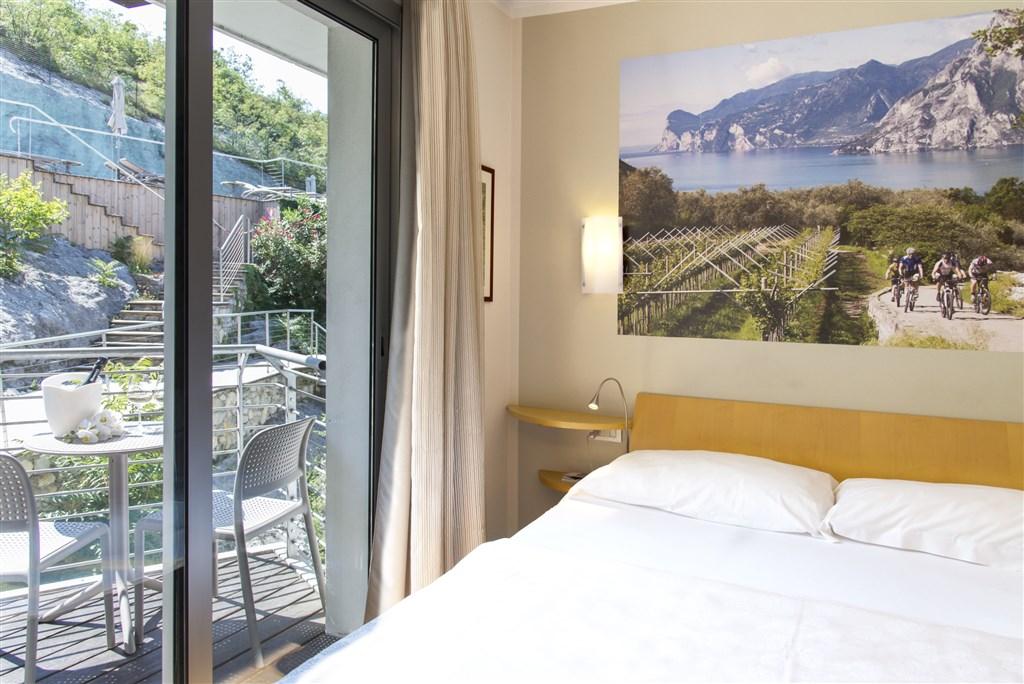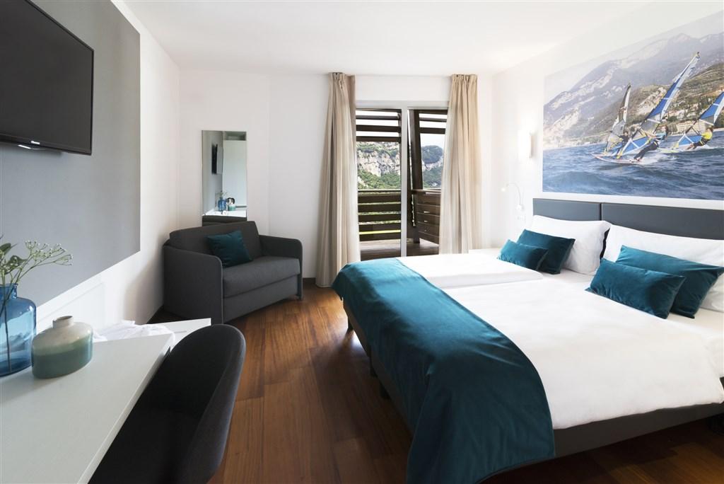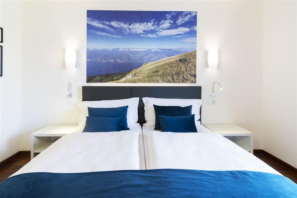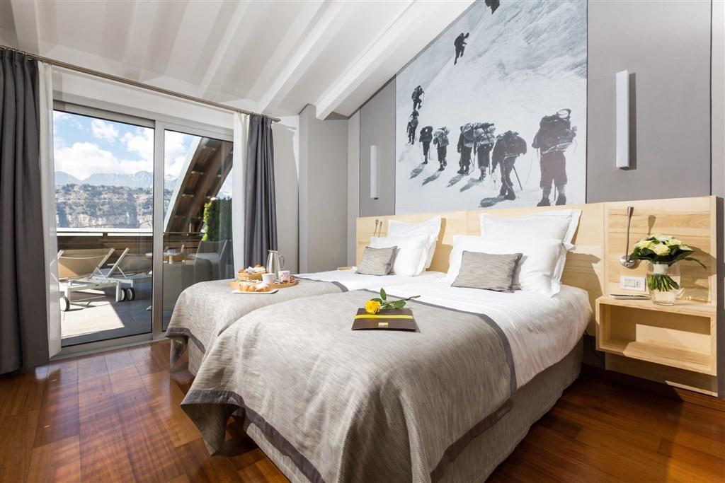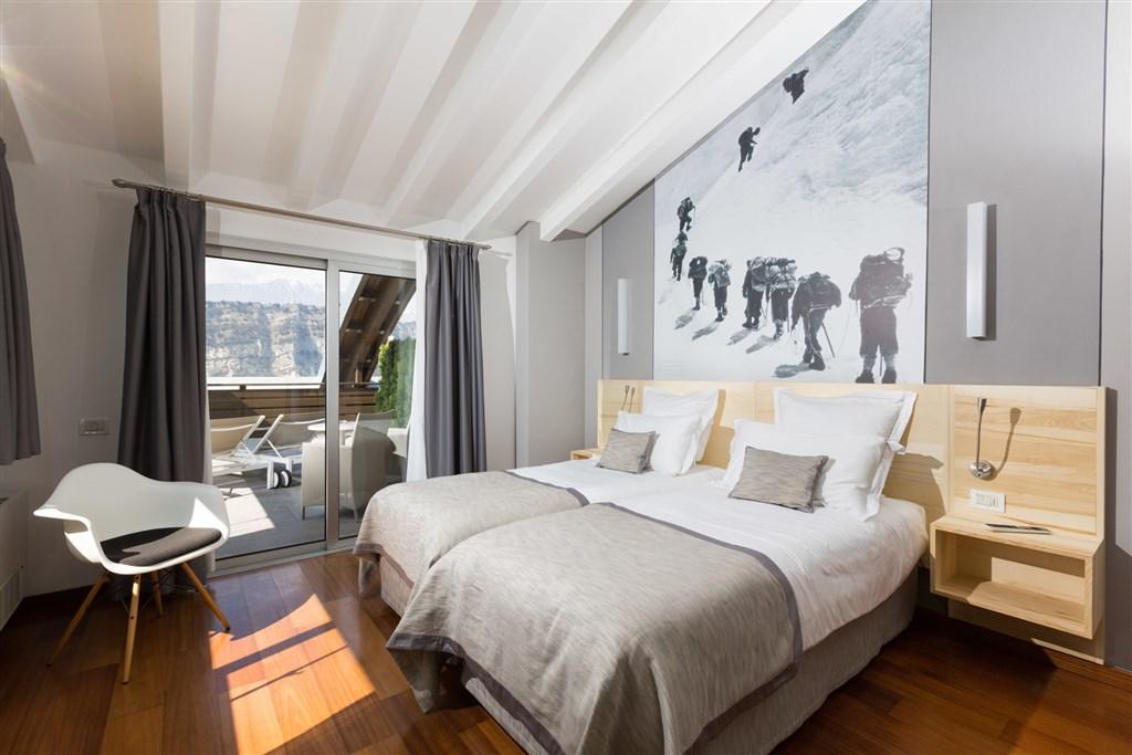 - Dvoulůžkové pokoje Sport Boutique: cca 23 m2, v nejvyšším patře, panoramatická terasa s výhledem na jezero.