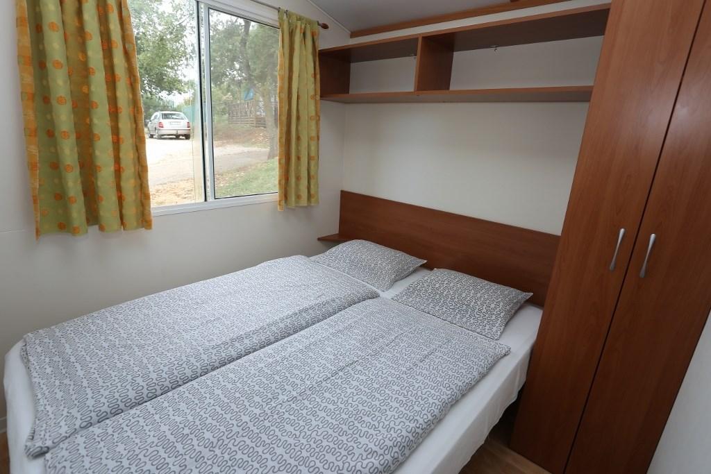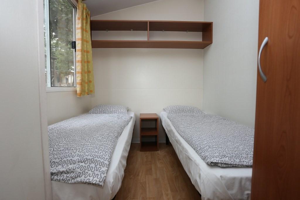 ► v jedné ložnici je manželská postel, ve druhé ložnici jsou dvě samostatná lůžka, ve třetí ložnici jsou dvě lůžka, jedno z nich je patrové, obě je možno sklopit a získat tak úložný prostor (kola, dětská postýlka, aj.) Patrová postel je vhodná pro osobu do 175 cm výšky a váhy 75 kg
