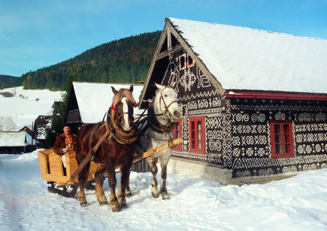 malované srubové domy, překrásný kroj a lidová výšivka jsou typické