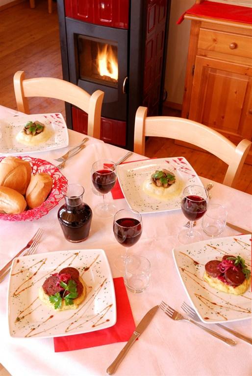 Večeře: servírovaná s výběrem ze 3 prvních chodů a ze 3 hlavních chodů (pro děti platí dětské menu): v ceně na osobu- první chod a hlavní jídlo s přílohou, miska salátu; nápoje a zákusek za poplatek