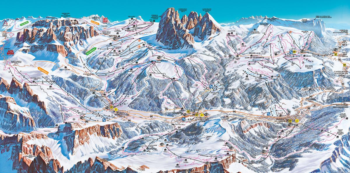 Val Gardena platí pro skiareály Val Gardena a Alpe di Siusi, tedy pro všechna přepravní zařízení označená ve skimapě číslem; z důvodu napojení střediska na Sella Rondu a jen o málo nižší ceny oproti skipasu Dolomiti Superski není zprostředkováván CK#Skibus