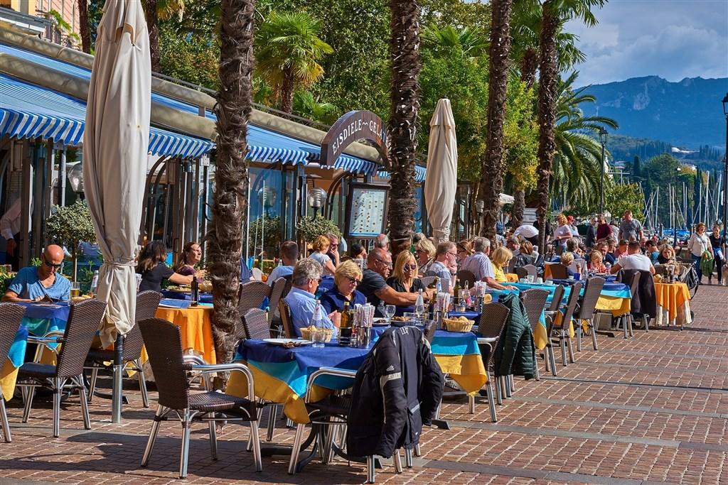 u jezera Lago di Garda. Restaurace, bary a nákupní možnosti jsou