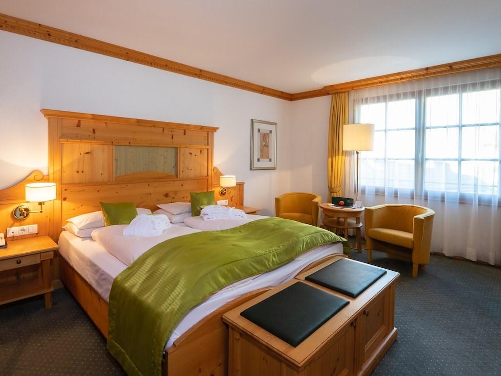 - Dvoulůžkové pokoje Alpina: cca 30 m2, manželské dvoulůžko (2 matrace, postele lze oddělit) a přistýlky formou pevných lůžek, navíc balkon.